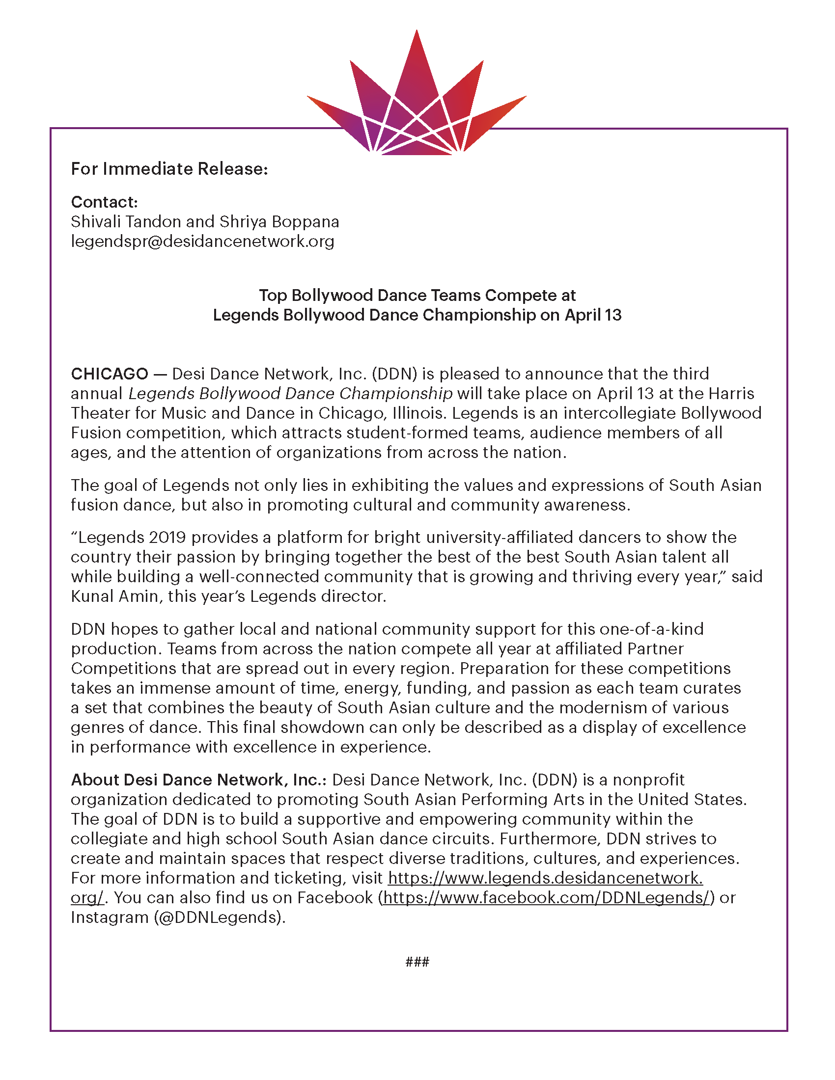 Legends Bollywood Dance Championship in Chicago for 2019 national competition